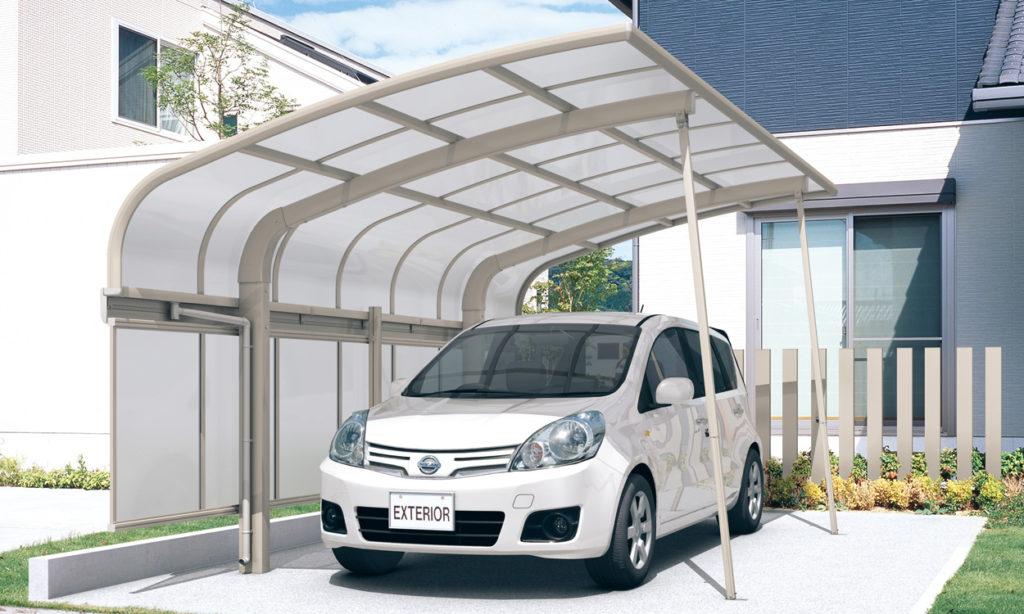背面支え型などは圧迫感が軽減されます。また柱を高くしたほうが軒下が広がり圧迫感の軽減に効果があります。しかし高すぎると雨が降り込みやすなり雨除け効果も弱くなるので車両高とのバランスも考慮すべきです。また「ポリカーボネイト」などの光を通す素材は圧迫感の軽減にも繋がります。
